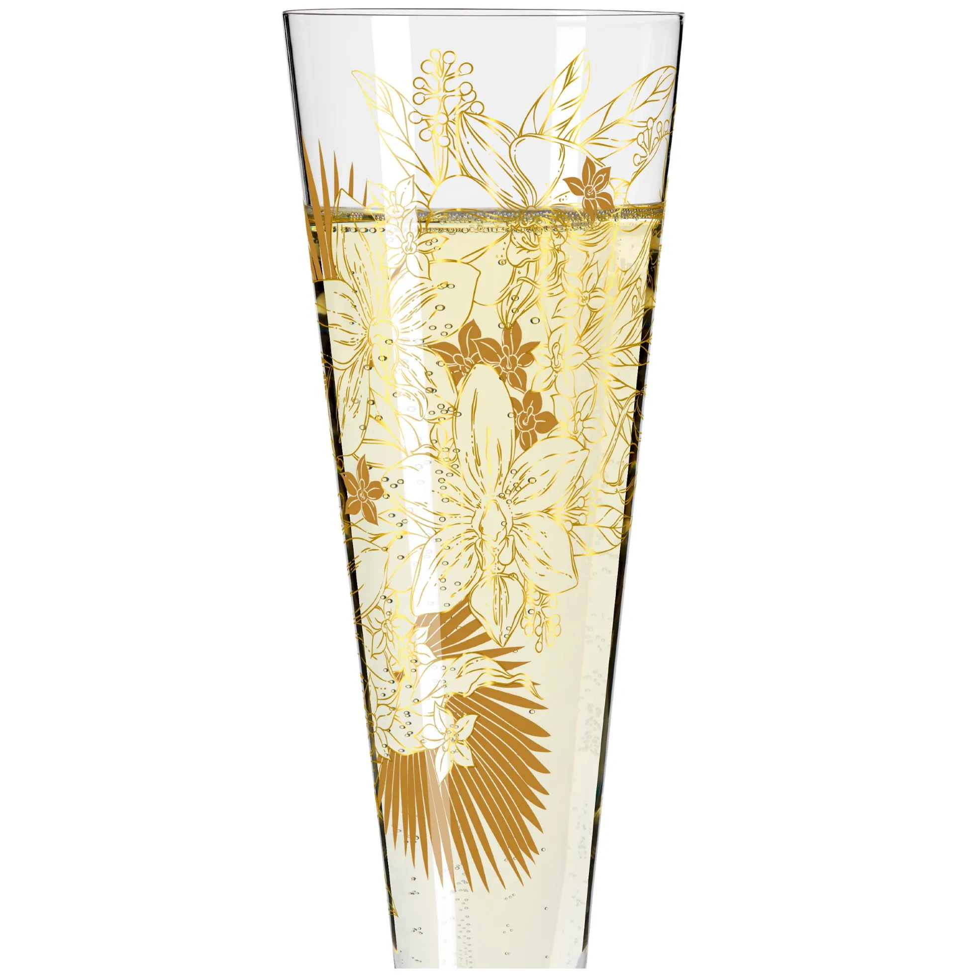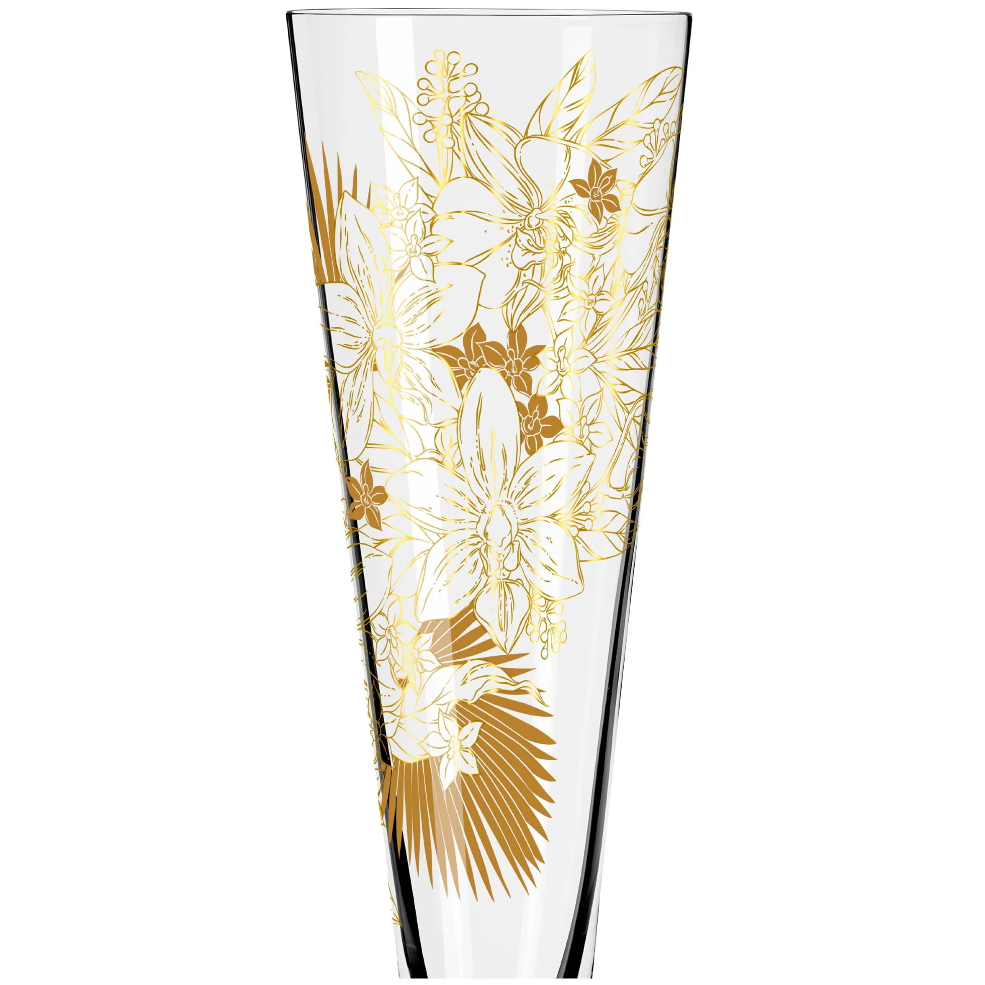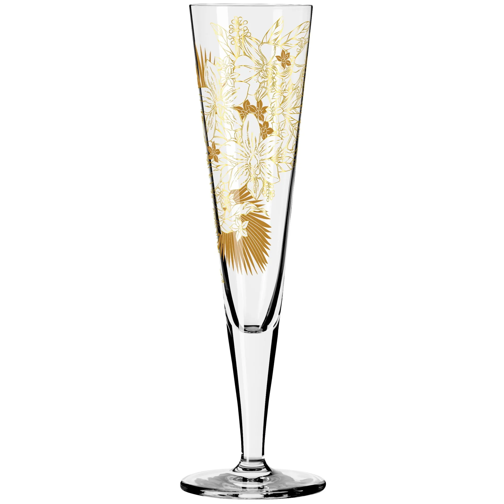Das Champusglas zelebriert die Schönheit prachtvoller Orchideen. Eine opulente Pflanze, die einer prickelnden Erfrischung mit Leidenschaft und Hingabe metaphorisch eine goldene Krone aufsetzt.