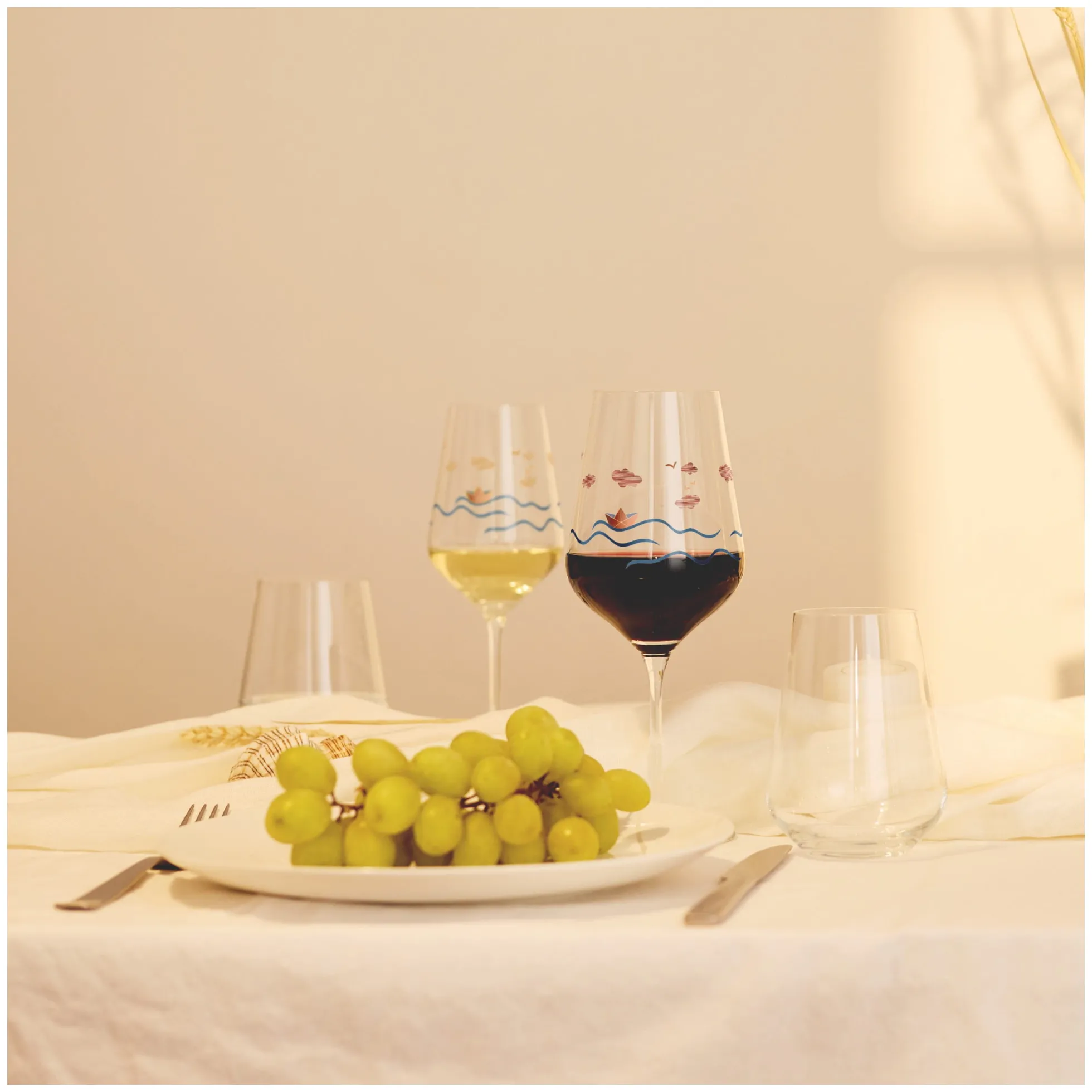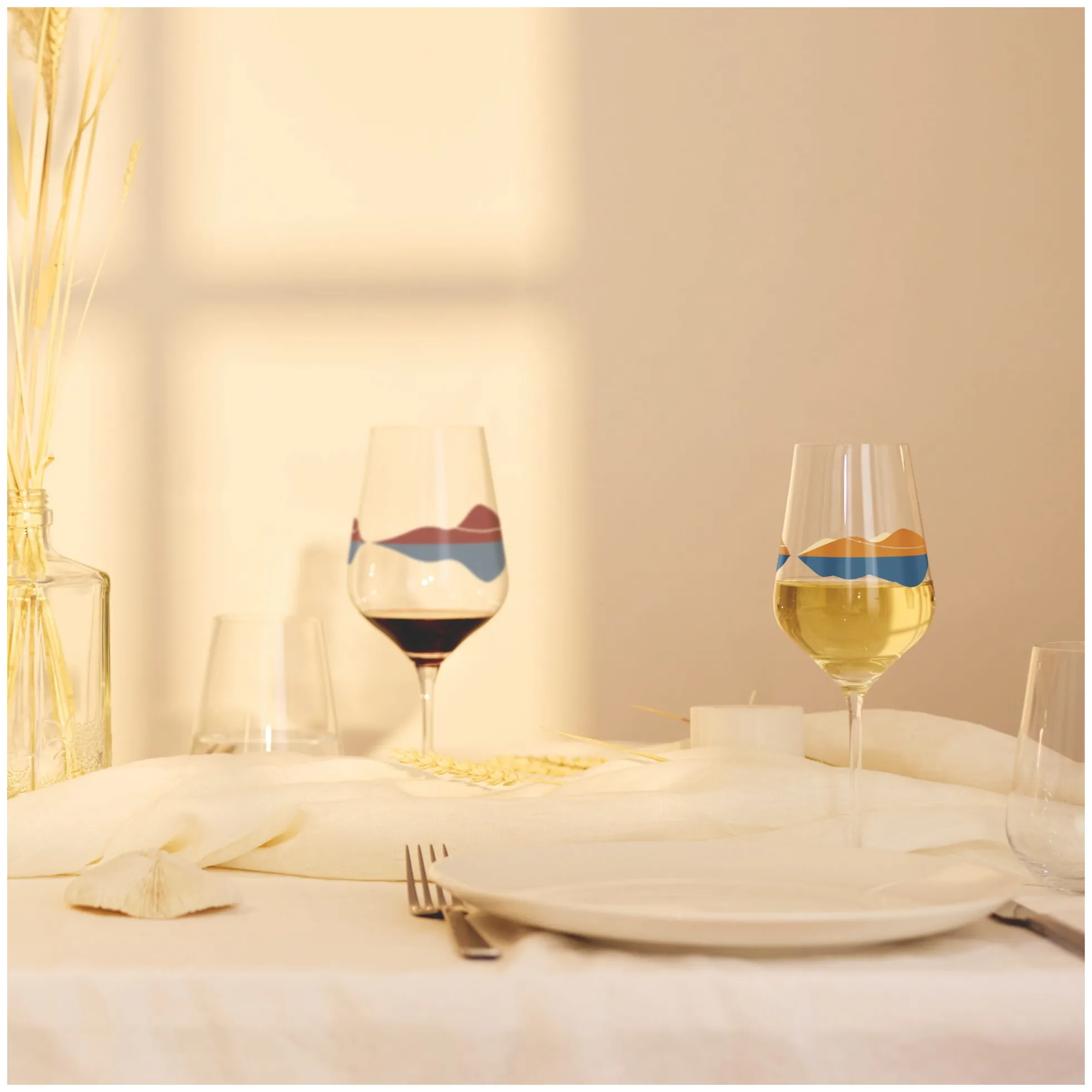 Willkommen in der Weite. Die Dekore lassen mit geschwungenen Linien die Illusion einer Landschaft entstehen, in der Auge, Geist und Gaumen bei einem Rotwein auf Reisen gehen.