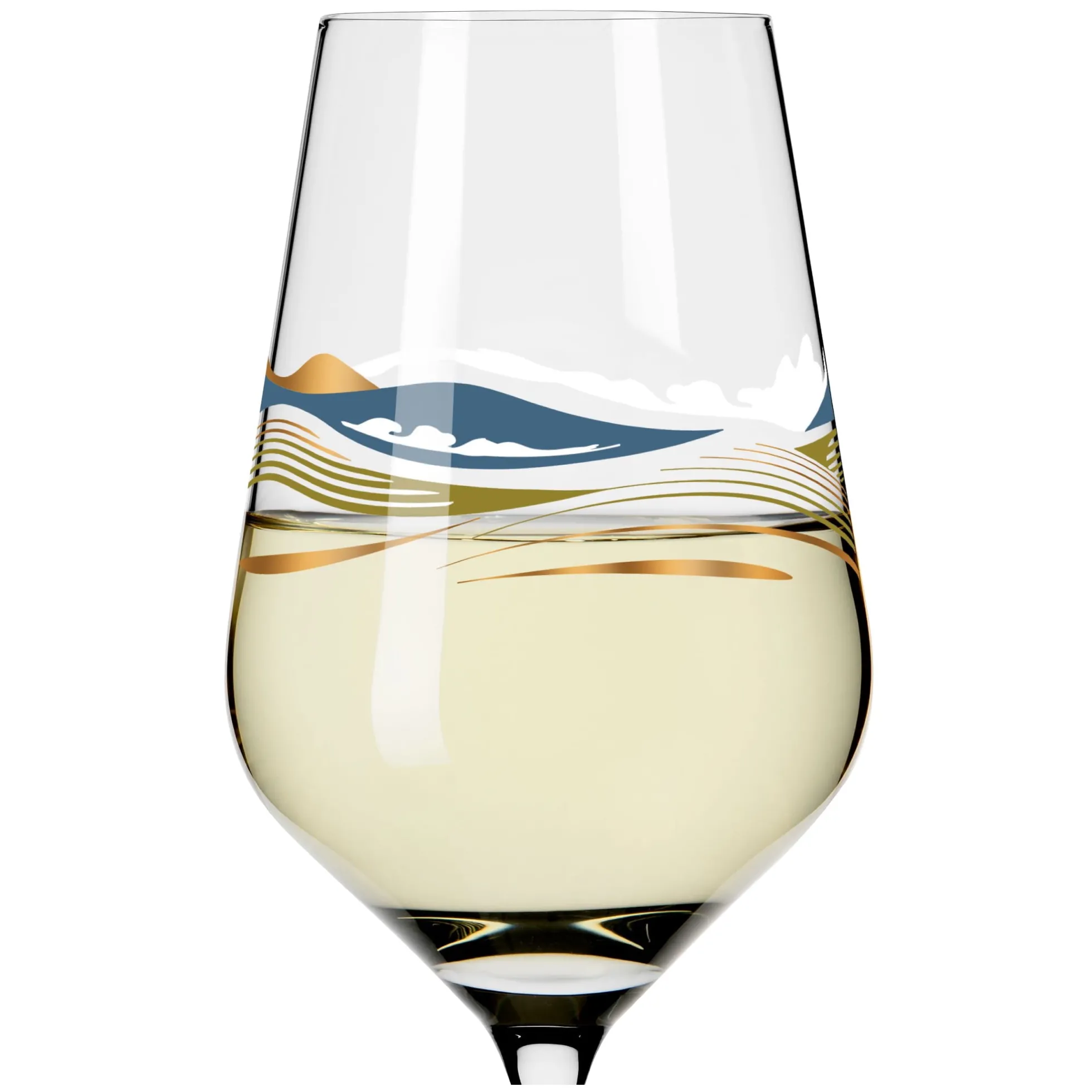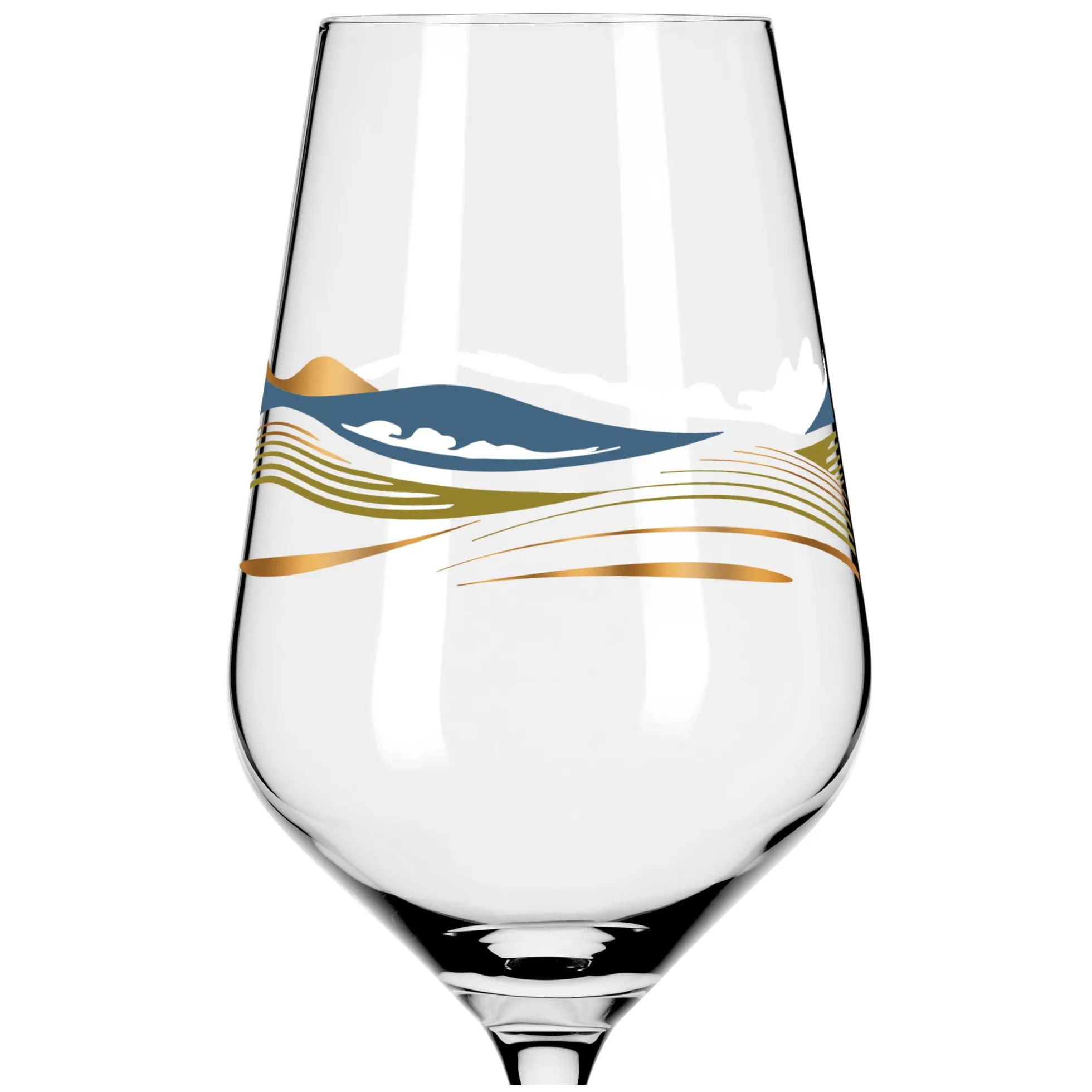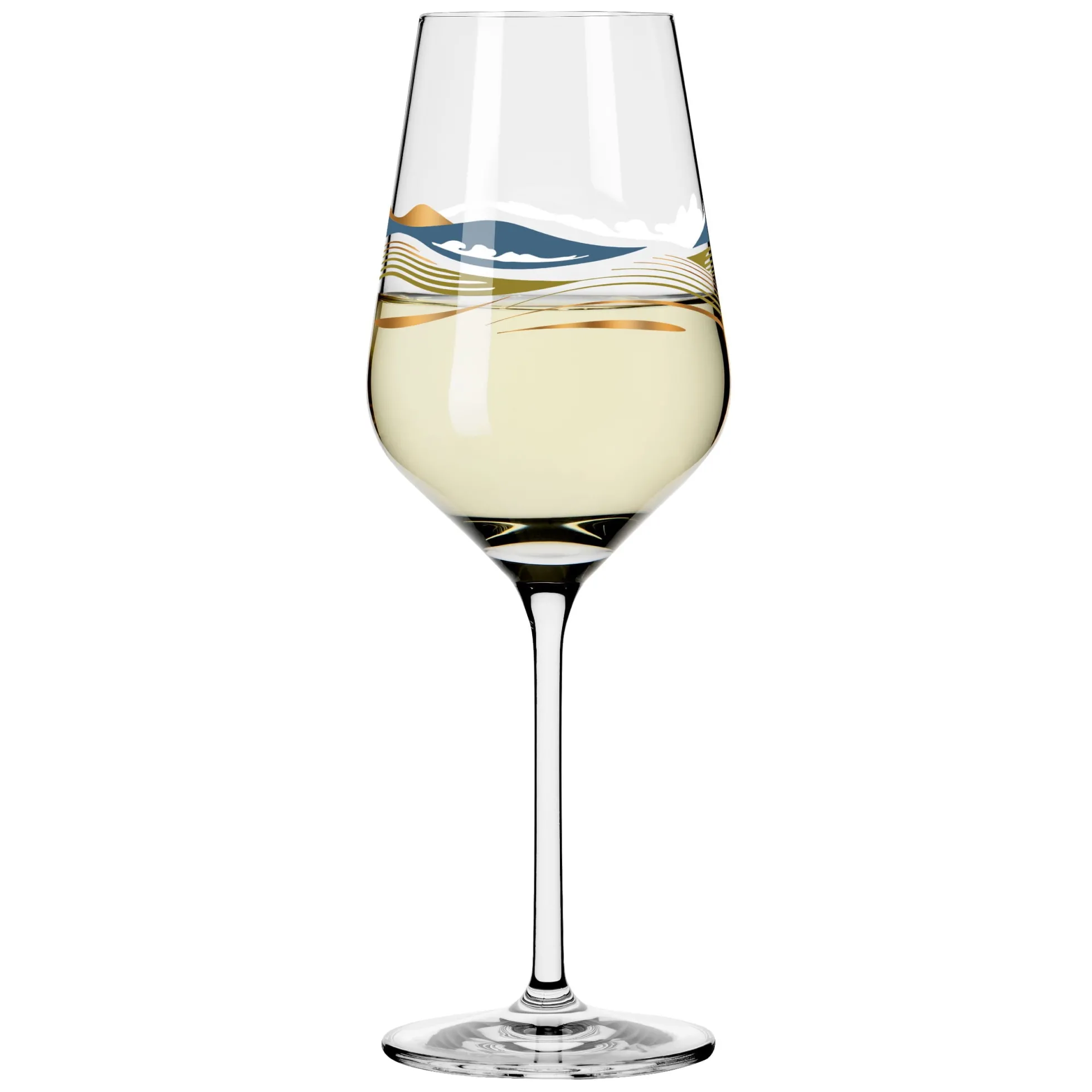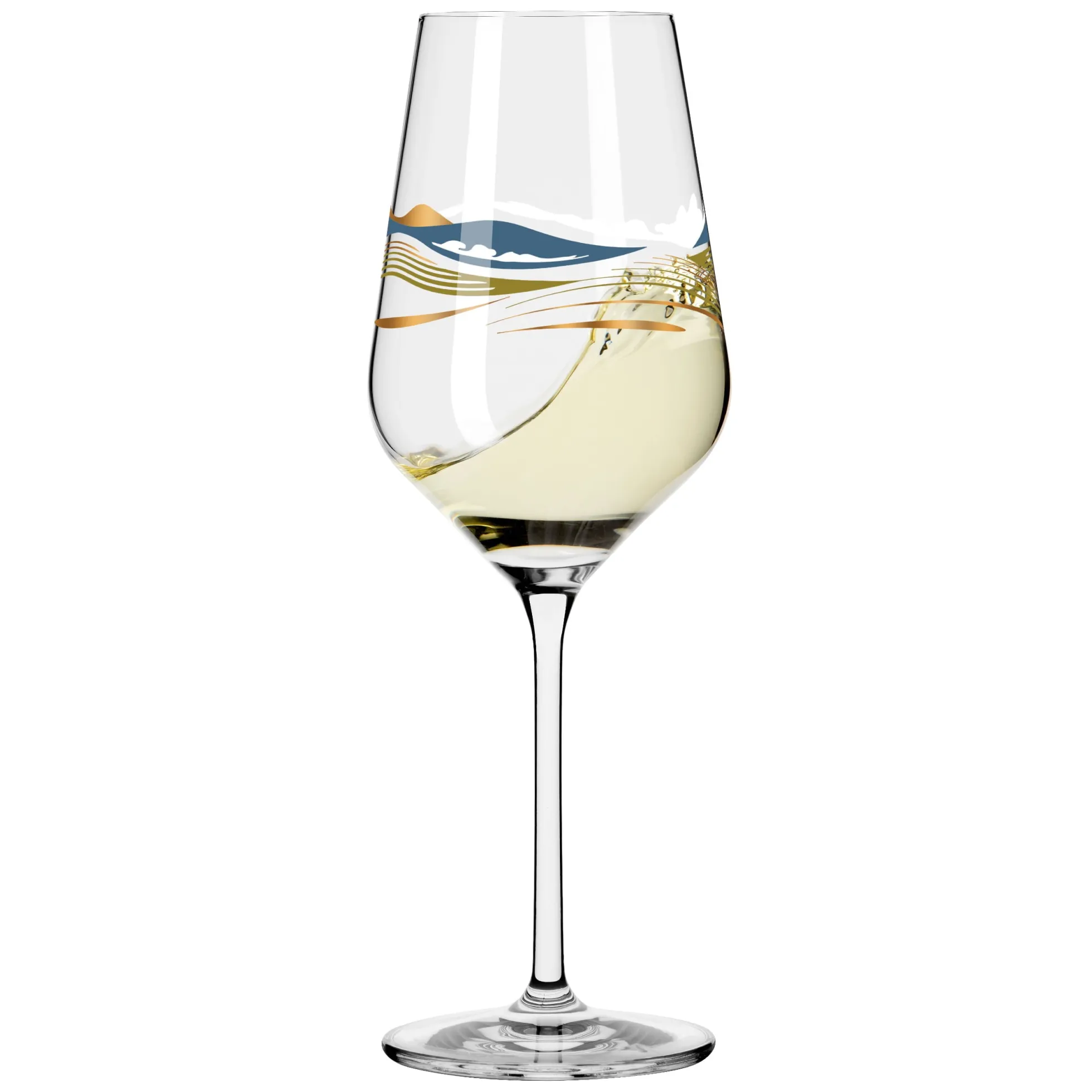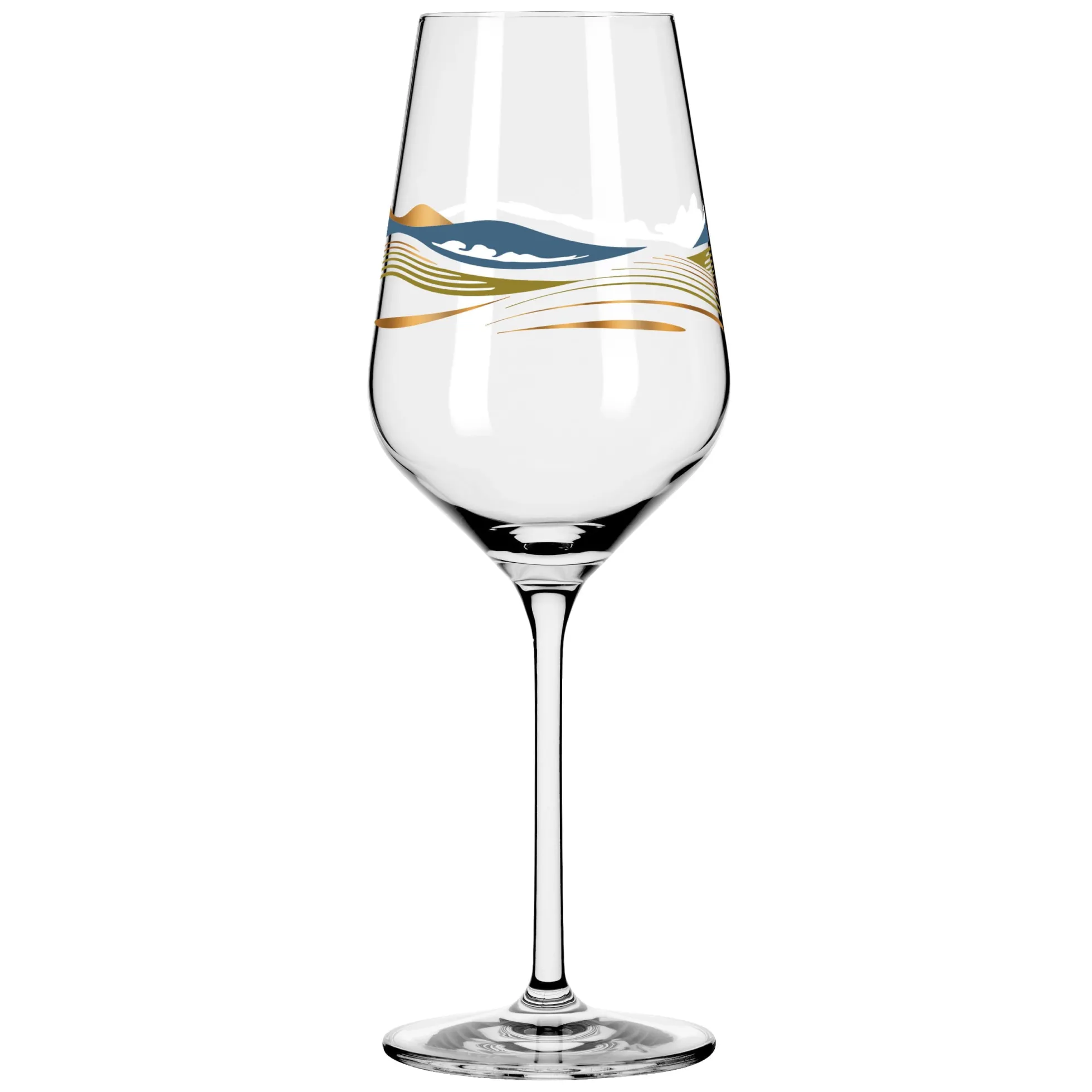 Willkommen in der Weite. Das Dekor lässt mit geschwungenen Linien in spritzigen Farben die Illusion einer Landschaft entstehen, in der Auge, Geist und Gaumen bei einem Weißwein auf Reisen gehen.