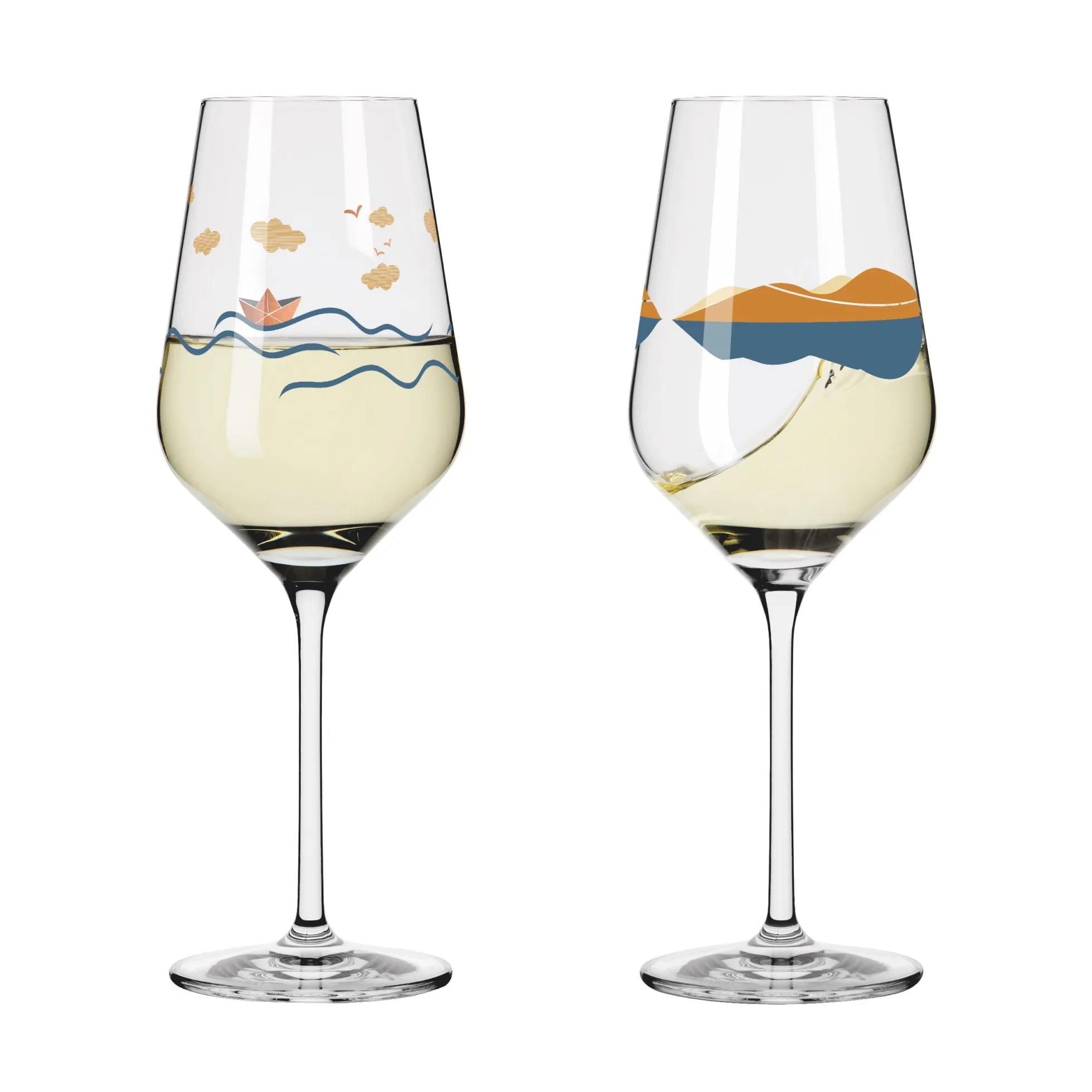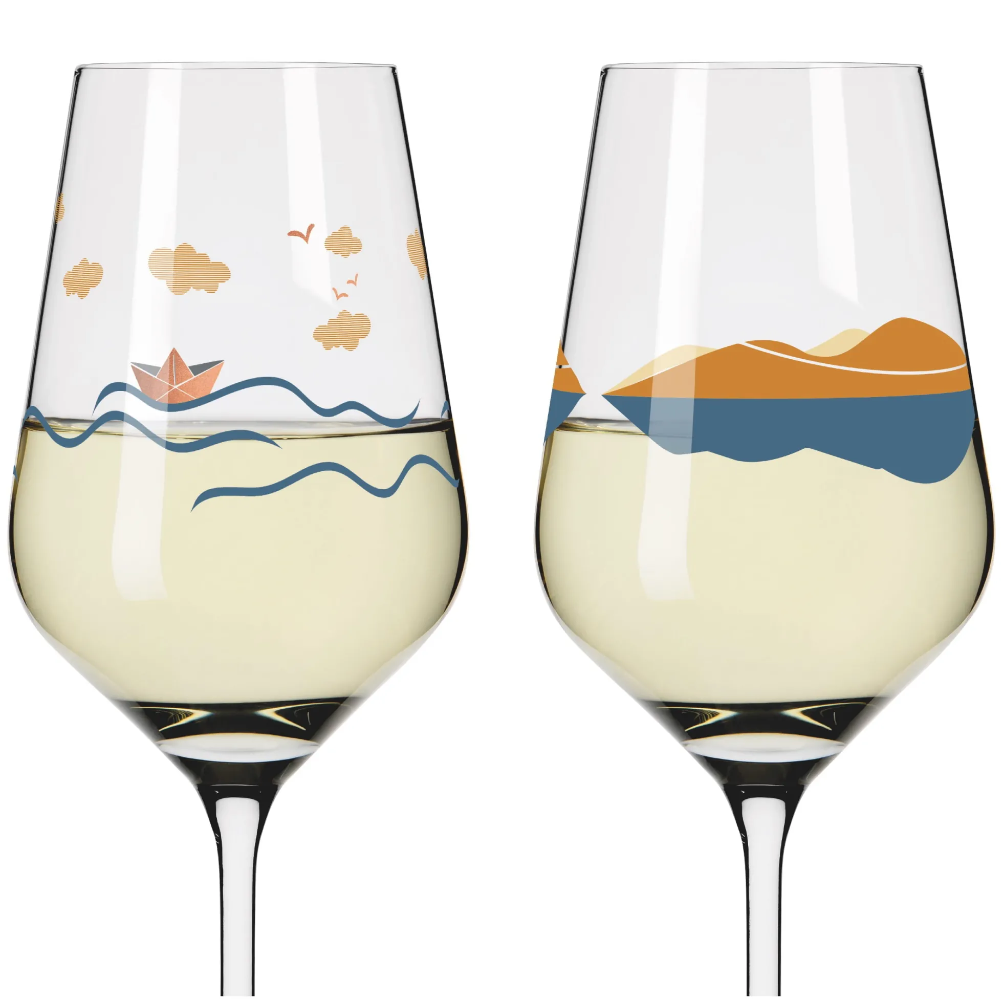 Willkommen in der Weite. Die Dekore lassen mit geschwungenen Linien die Illusion einer Landschaft entstehen, in der Auge, Geist und Gaumen bei einem Weißwein auf Reisen gehen.