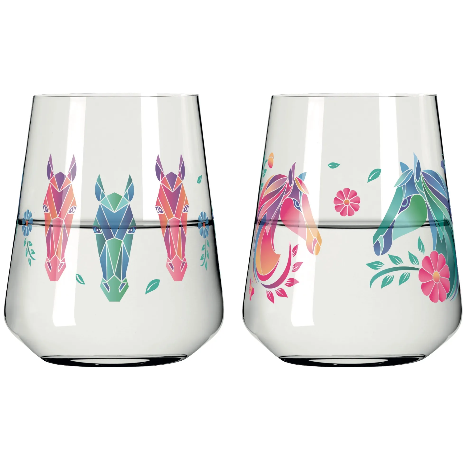 Zusammen bilden diese beiden Gläser ein faszinierendes Duo. Sie sind mehr als nur Behälter für ein erfrischendes Wasser; sie sind Kunstwerke, die Geschichten erzählen und die Verbindung zwischen Mensch und Tier auf eine einzigartige Weise feiern. In diesem graphischen Stil wird die Schönheit und Kraft der Pferde in einem neuen Licht präsentiert, das sowohl ansprechend als auch inspirierend ist.