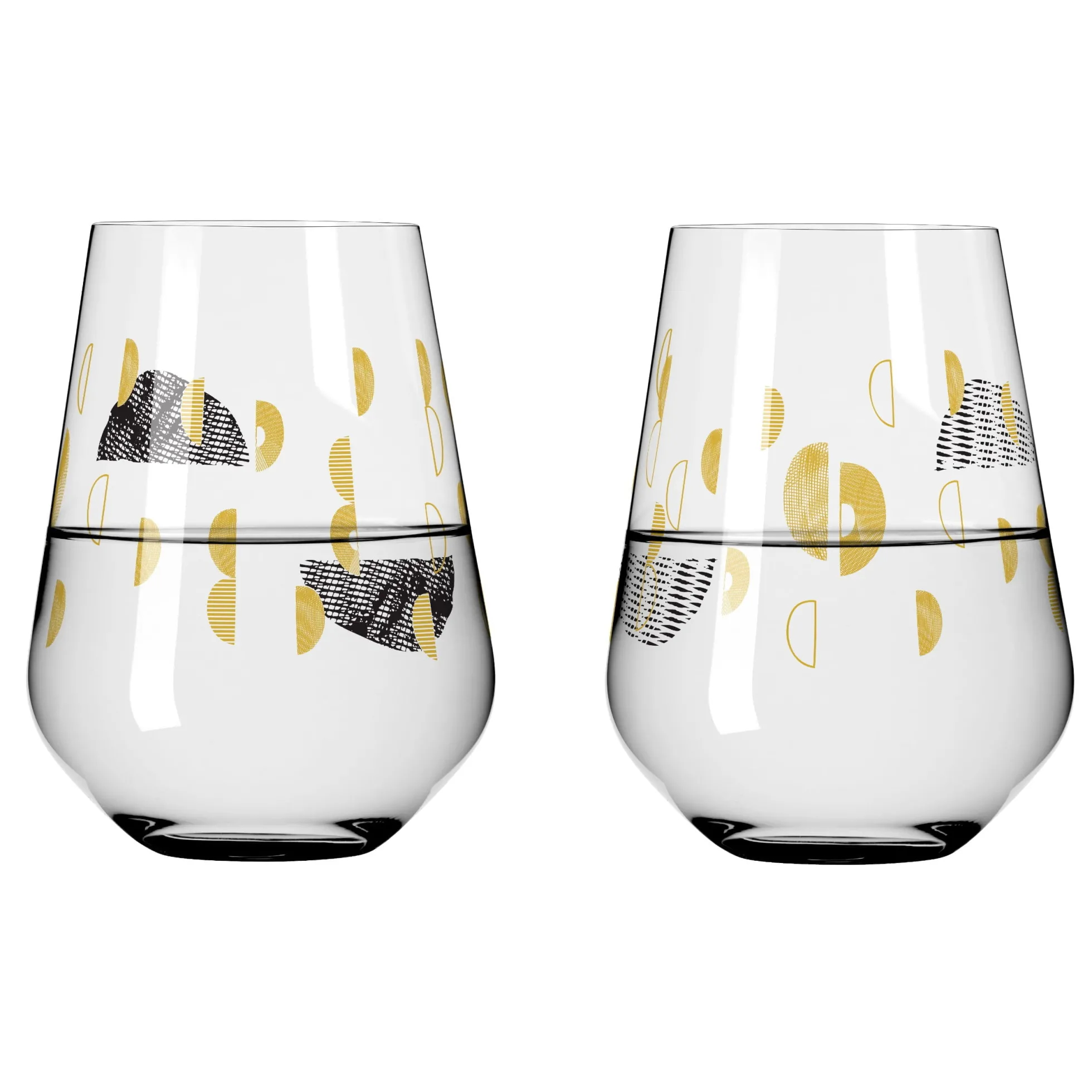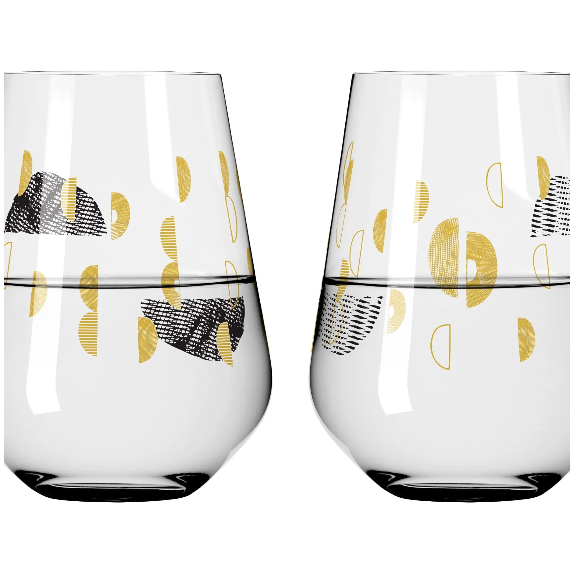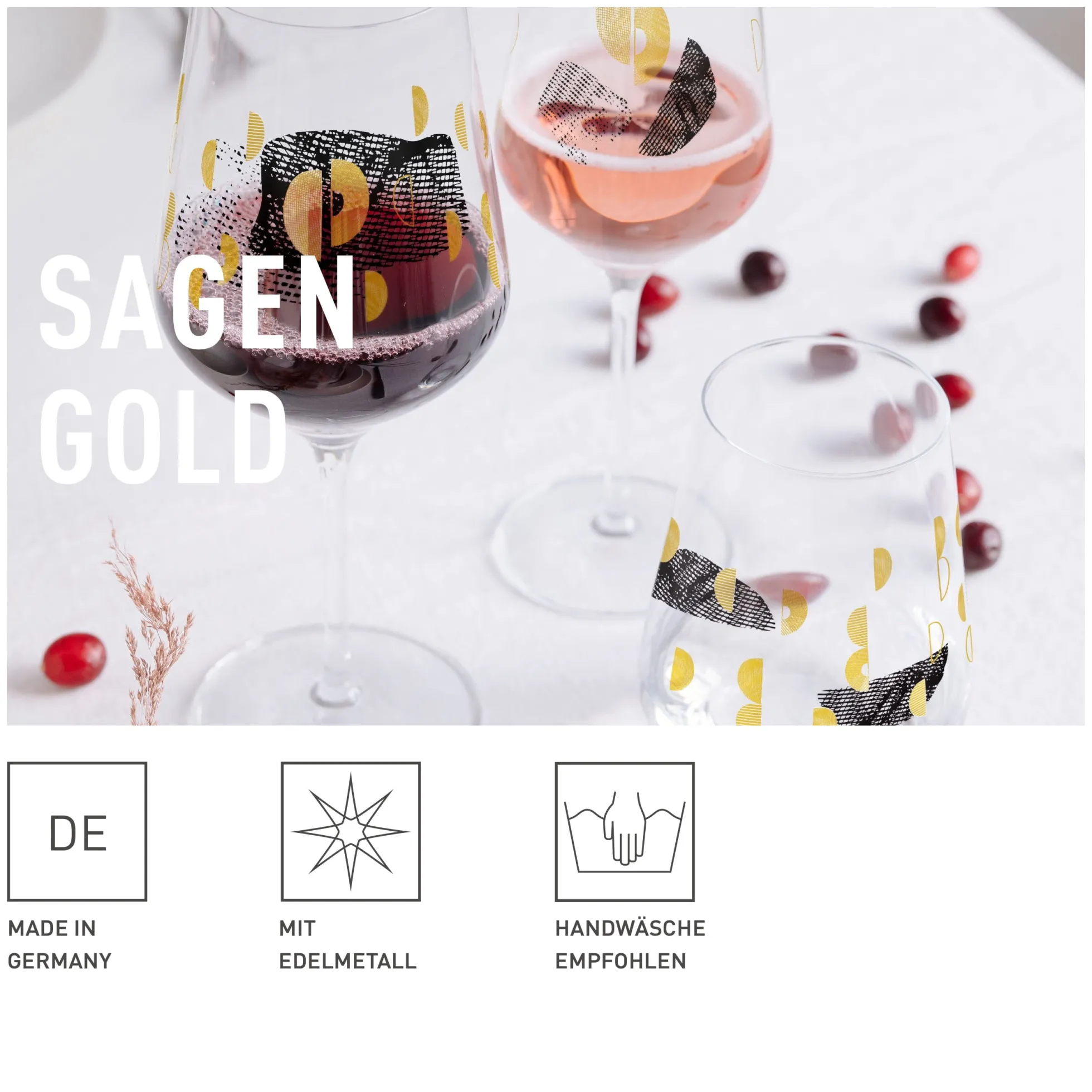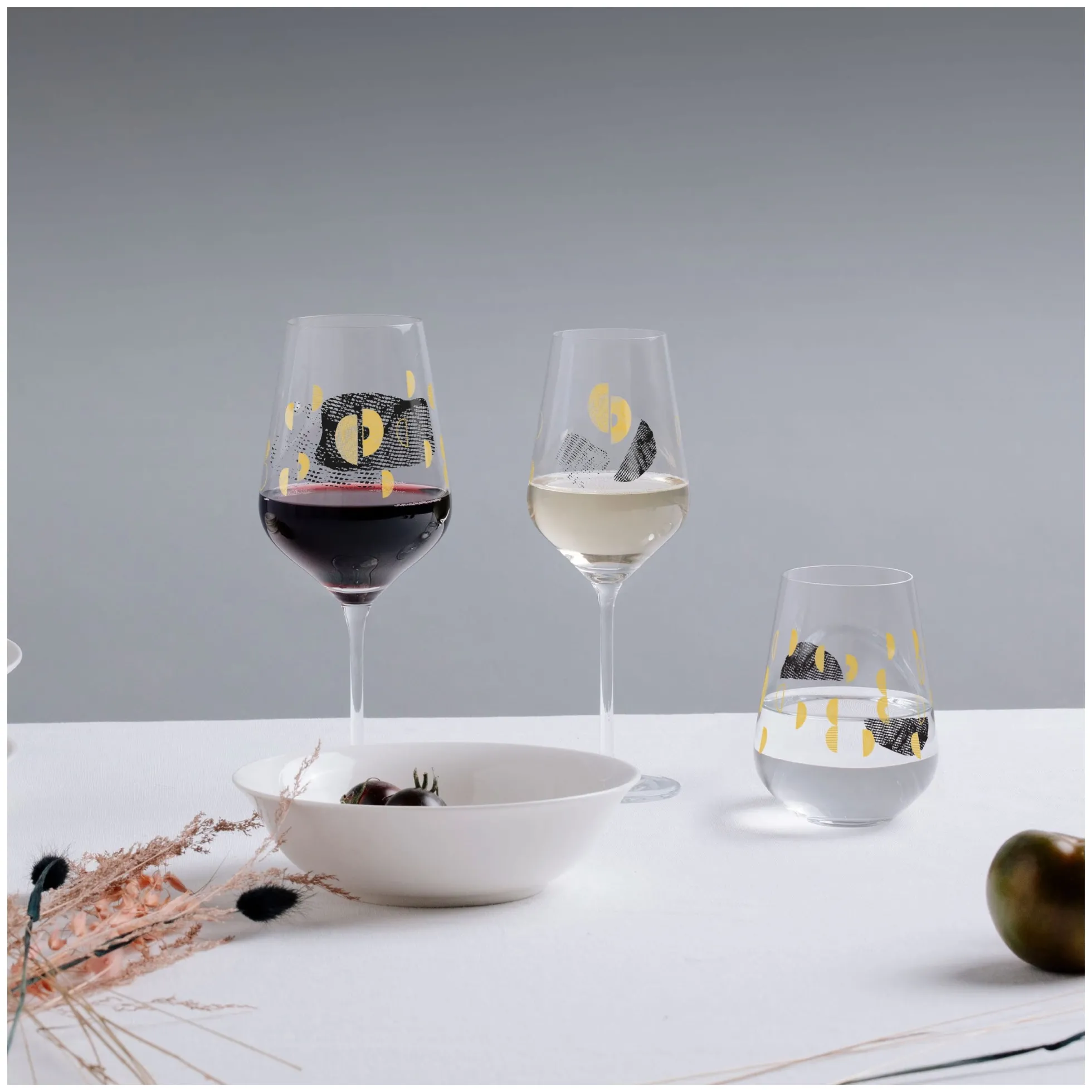 Sagenhafte Symbole: Feine Linien, Flächen und edles Gold gehen auf dem Wasserglas‐Set eine Schicksalsverbindung ein, um in Form von abstrahierten Trauben und Lebenslinien genussvoll zu feiern.