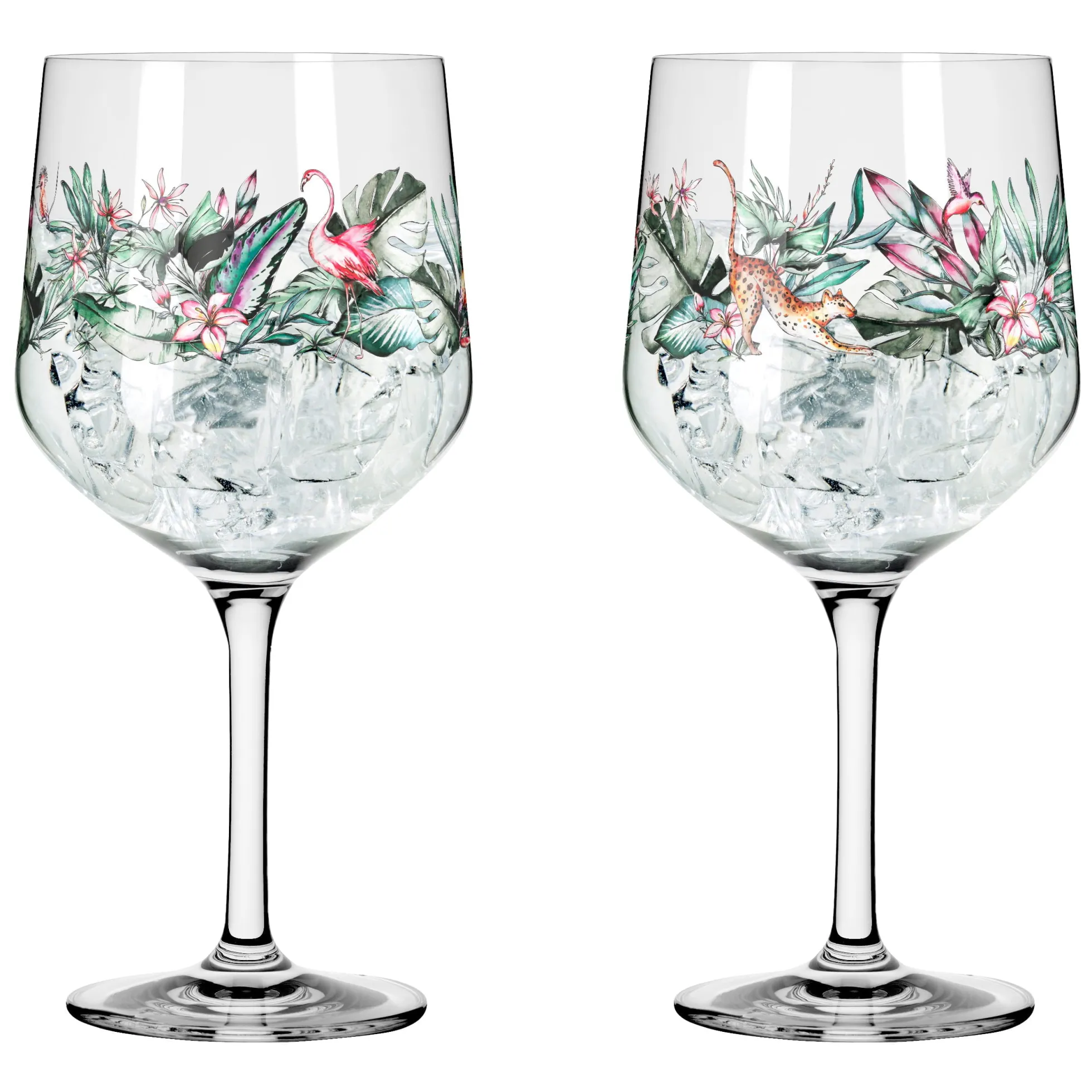Lebhaftes Getümmel: Im Schutze üppiger Pflanzen schleichen, schwirren und stolzieren exotische Tiere um das Glas, wodurch diesem eine faszinierende Lebendigkeit verliehen wird. Eine Hommage an die Schönheit der Natur!