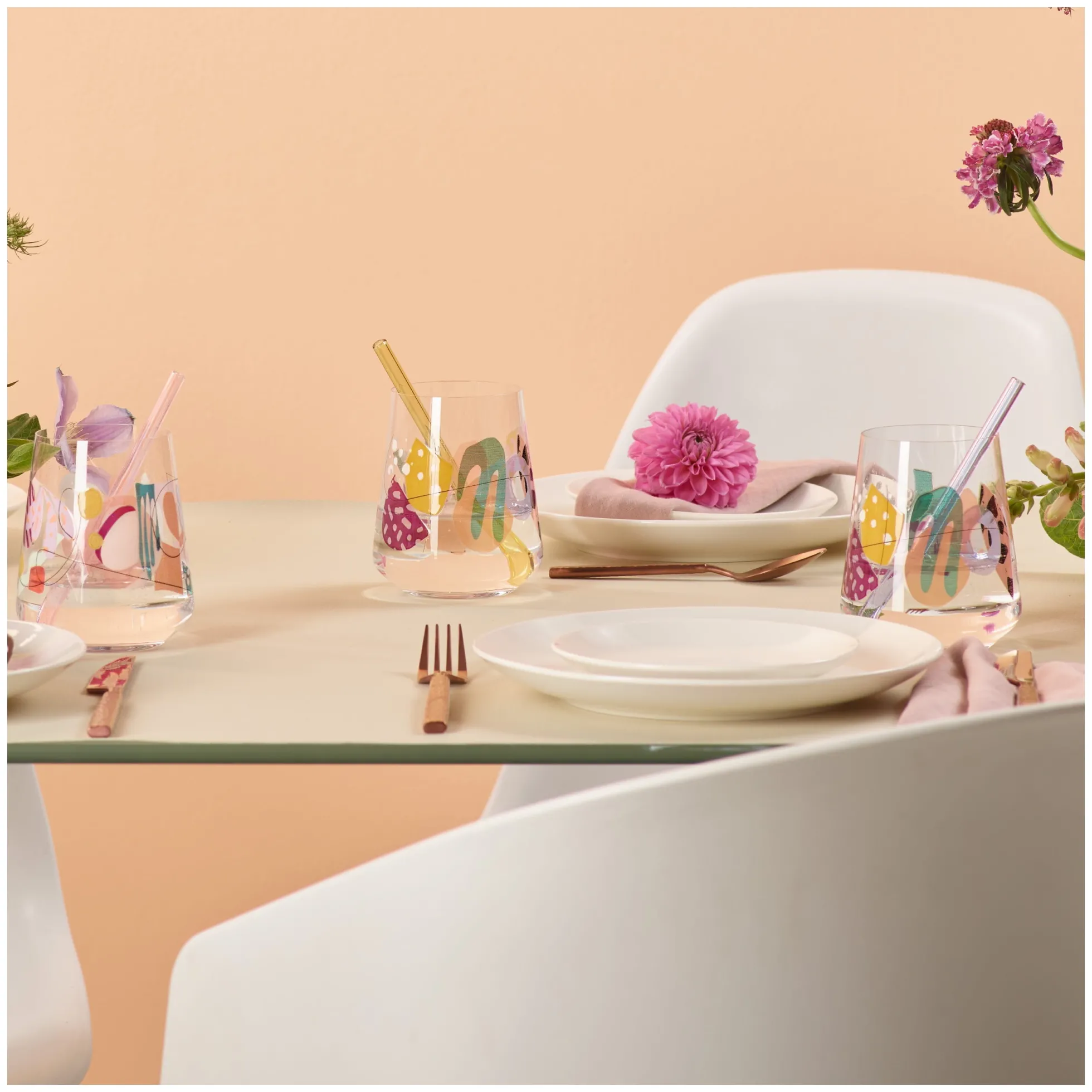 Alles auf Anfang: Das Allrounder‐Glas fängt den Beginn eines Abends atmosphärisch ein und feiert mit leuchtenden Farben und trendigen Mustern die Spontanität: Ein formschöner Eyecatcher in der Party‐Area.