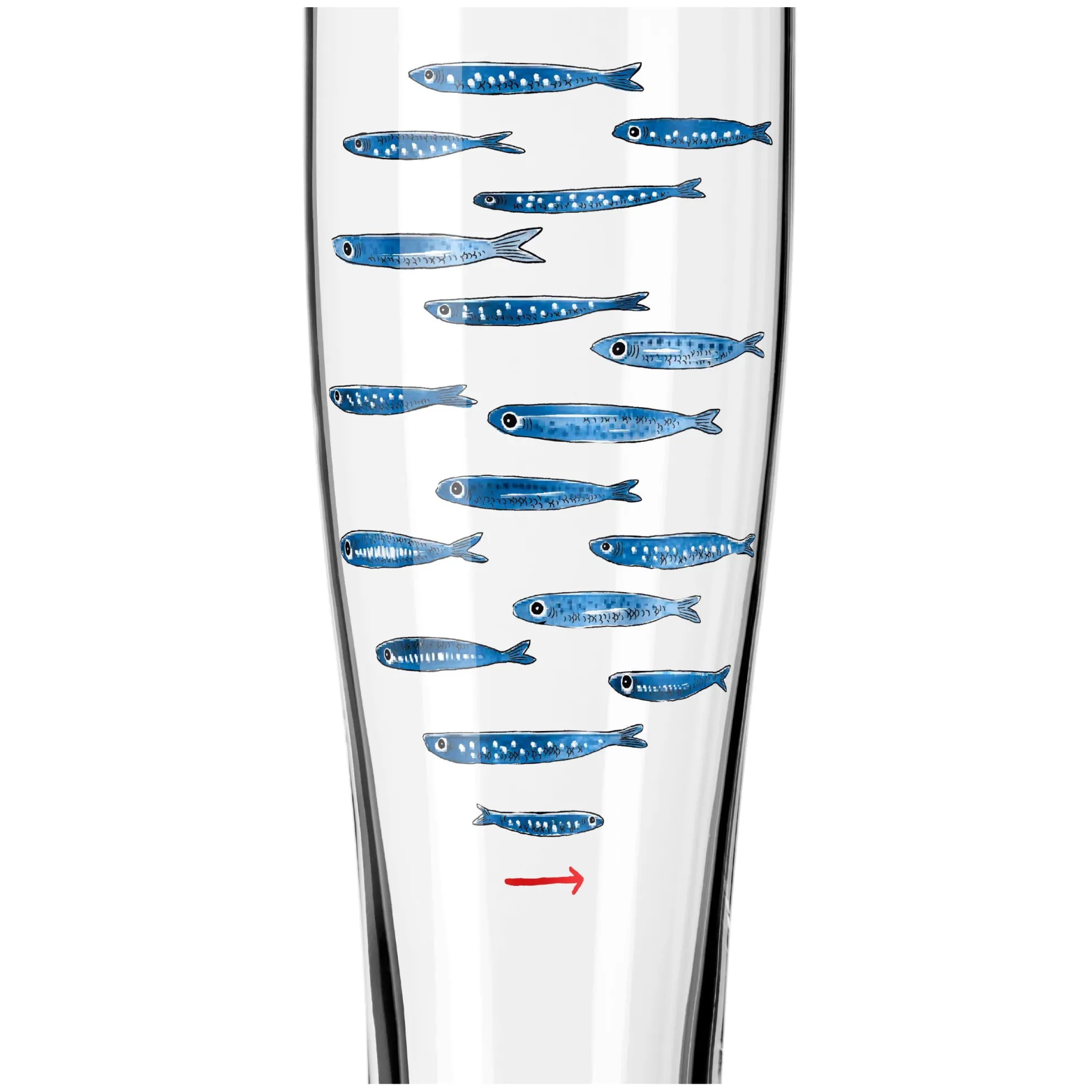 Möwe und Sardinen. Augenzwinkernd thematisiert das Design klassische Naturmotive, die auf den Weizengläsern mit modernem Strich und charakterhaften Details erfrischend frech dargestellt werden.