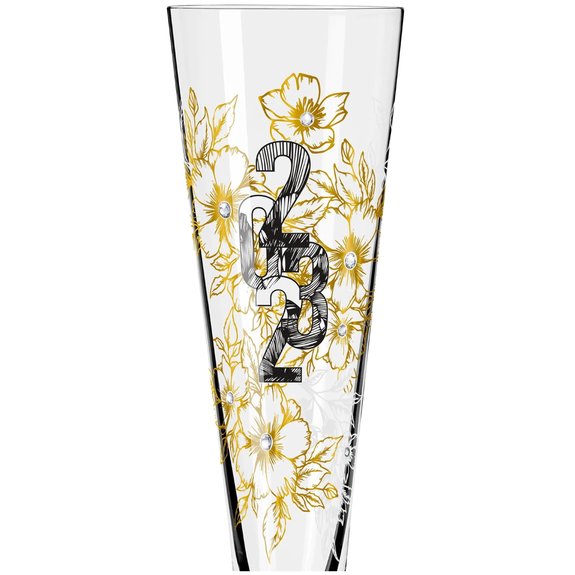 Ein Lichtfänger, der sich mit Luxus schmückt: Das Celebration Glas 2023 zeigt Exklusivität in ihrer schönsten Form ‐ mit echtem Gold, edlem Platin und Kristall‐Verzierungen in floralen Arrangements.