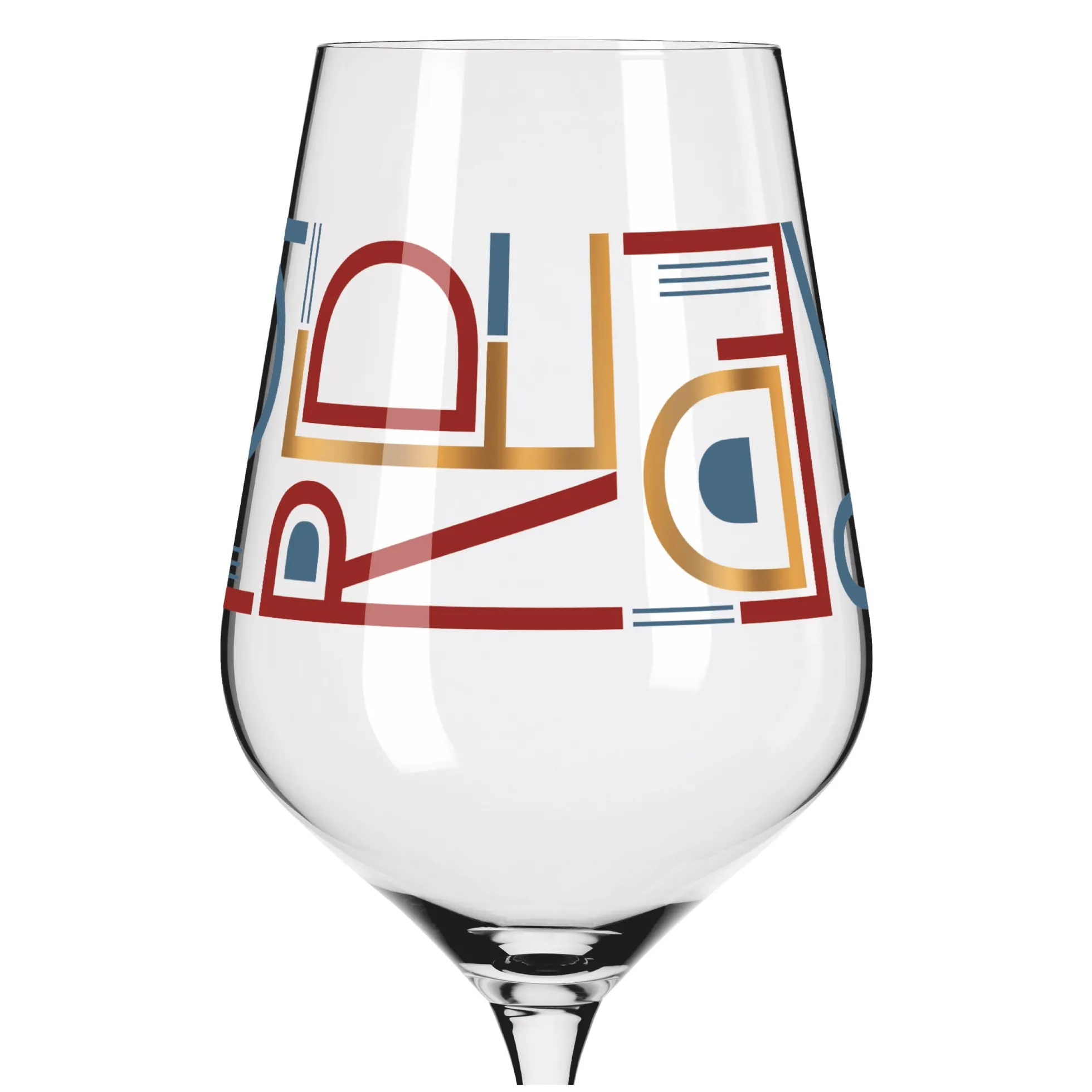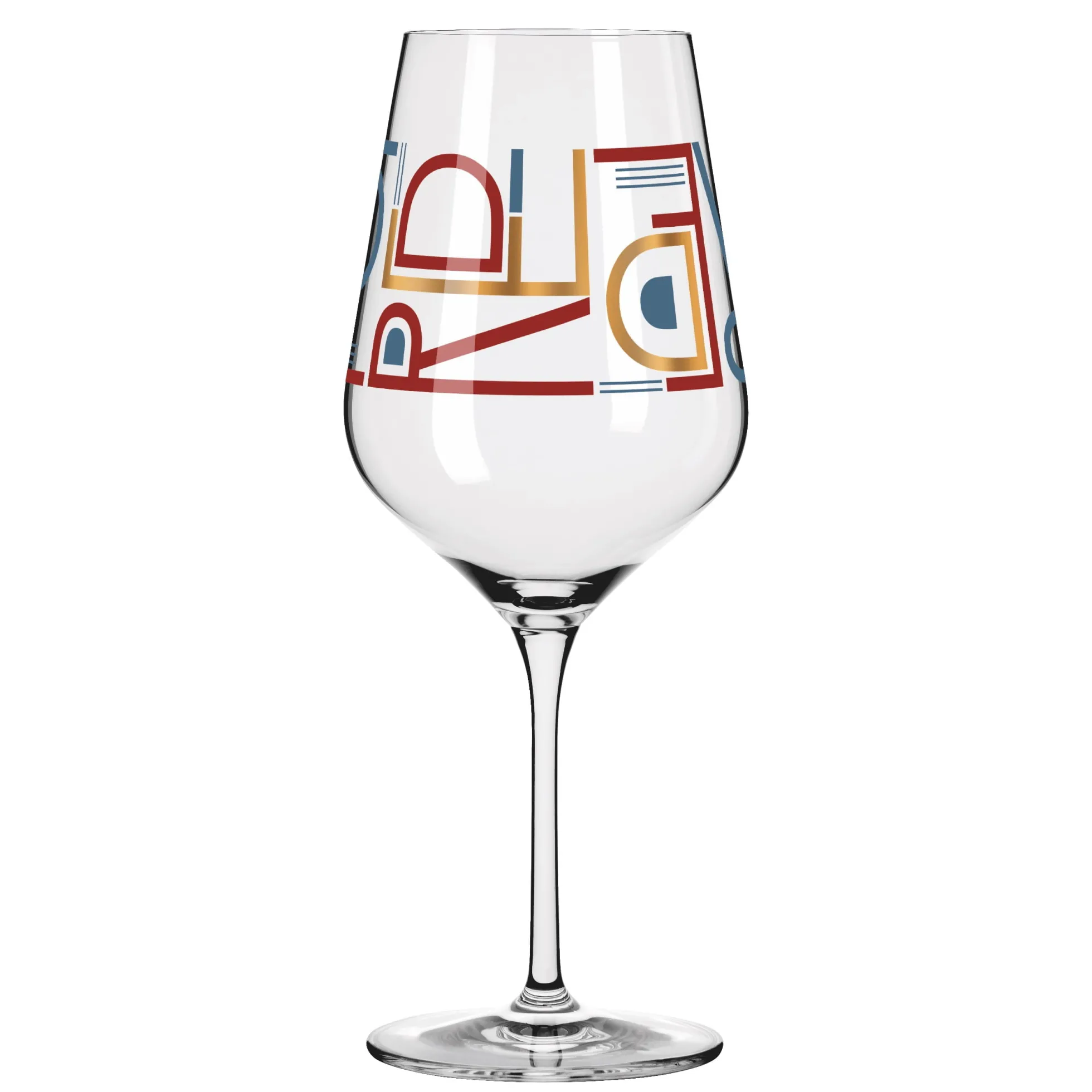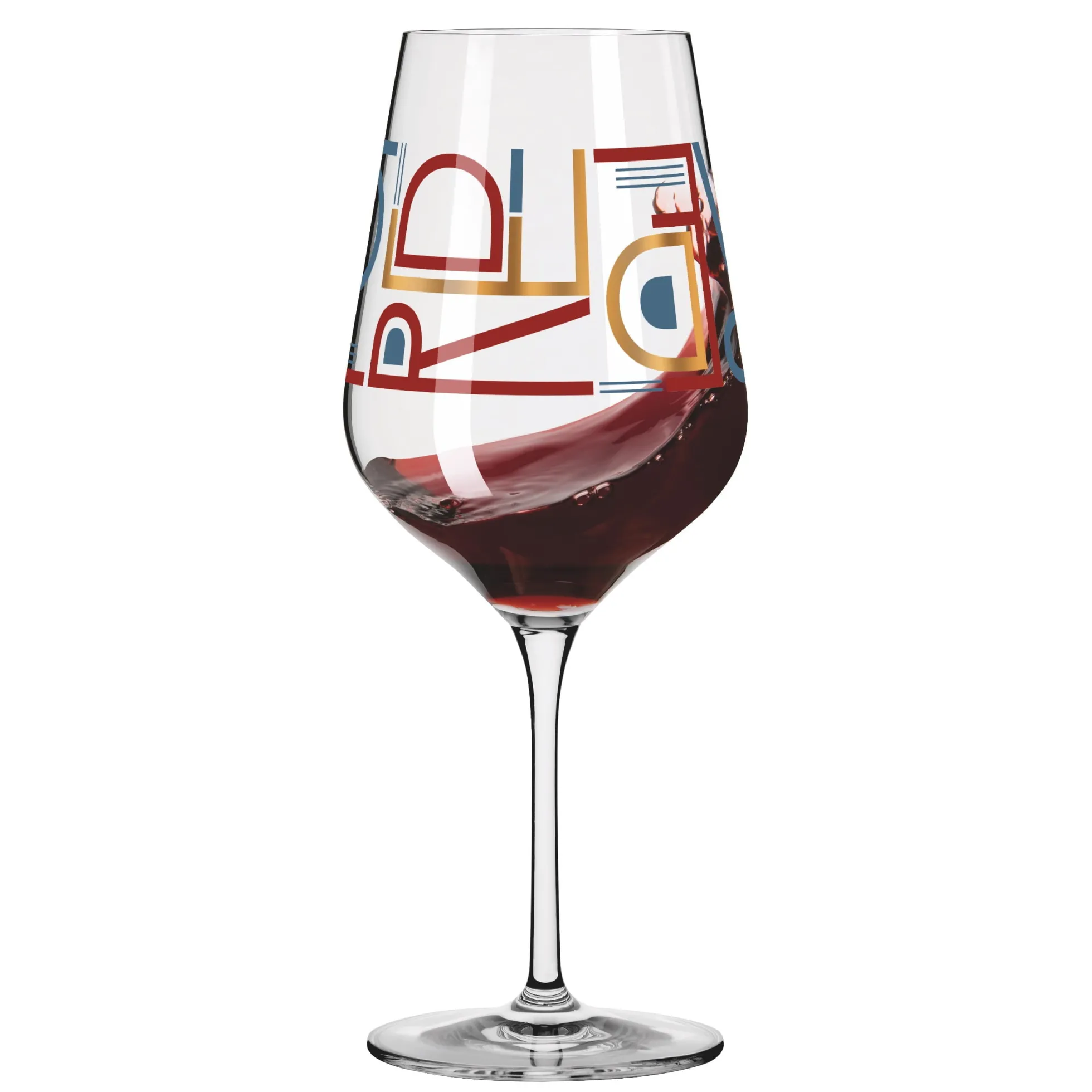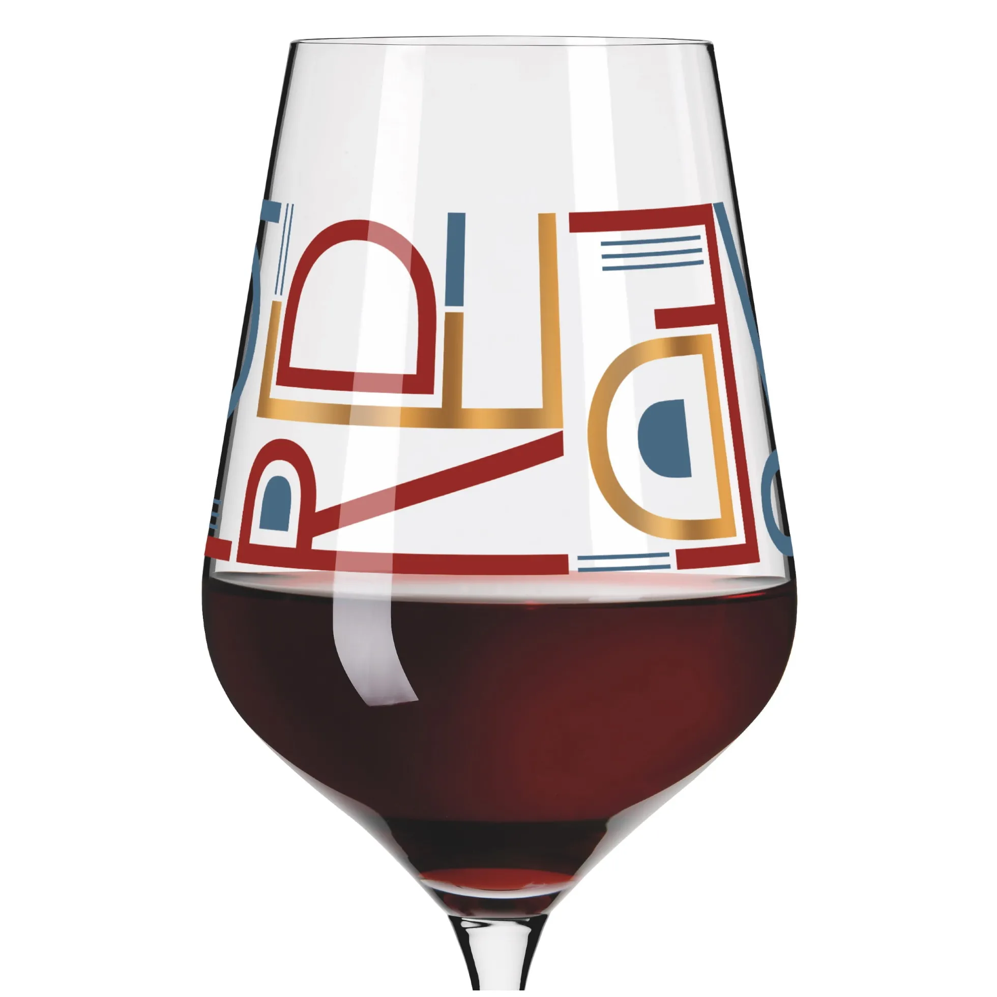 Zeichen guten Geschmacks. Im glamourösen Schriftbild der 20er‐Jahre laden Buchstaben zum Perspektivwechsel ein und lassen bei dem Rotweinglas in warmen Farben das Wort »Red« musterhaft erstrahlen.