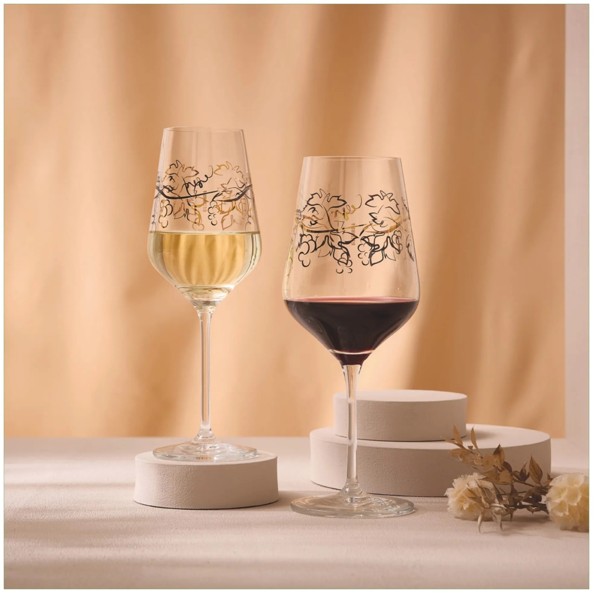 Elegant ranken sich die Weinreben um das Rotweinglas und geben den Dolden mit den saftigen Trauben Schutz und Halt. Hier warten sie geduldig auf die Lese um danach zu köstlichem Wein gekeltert zu werden.
