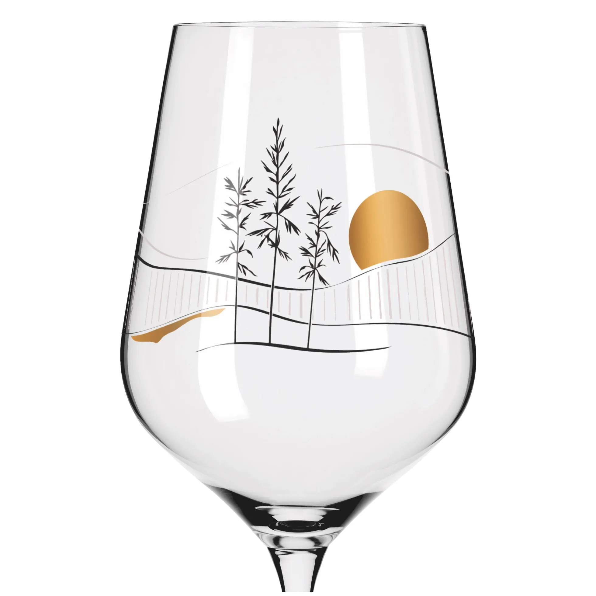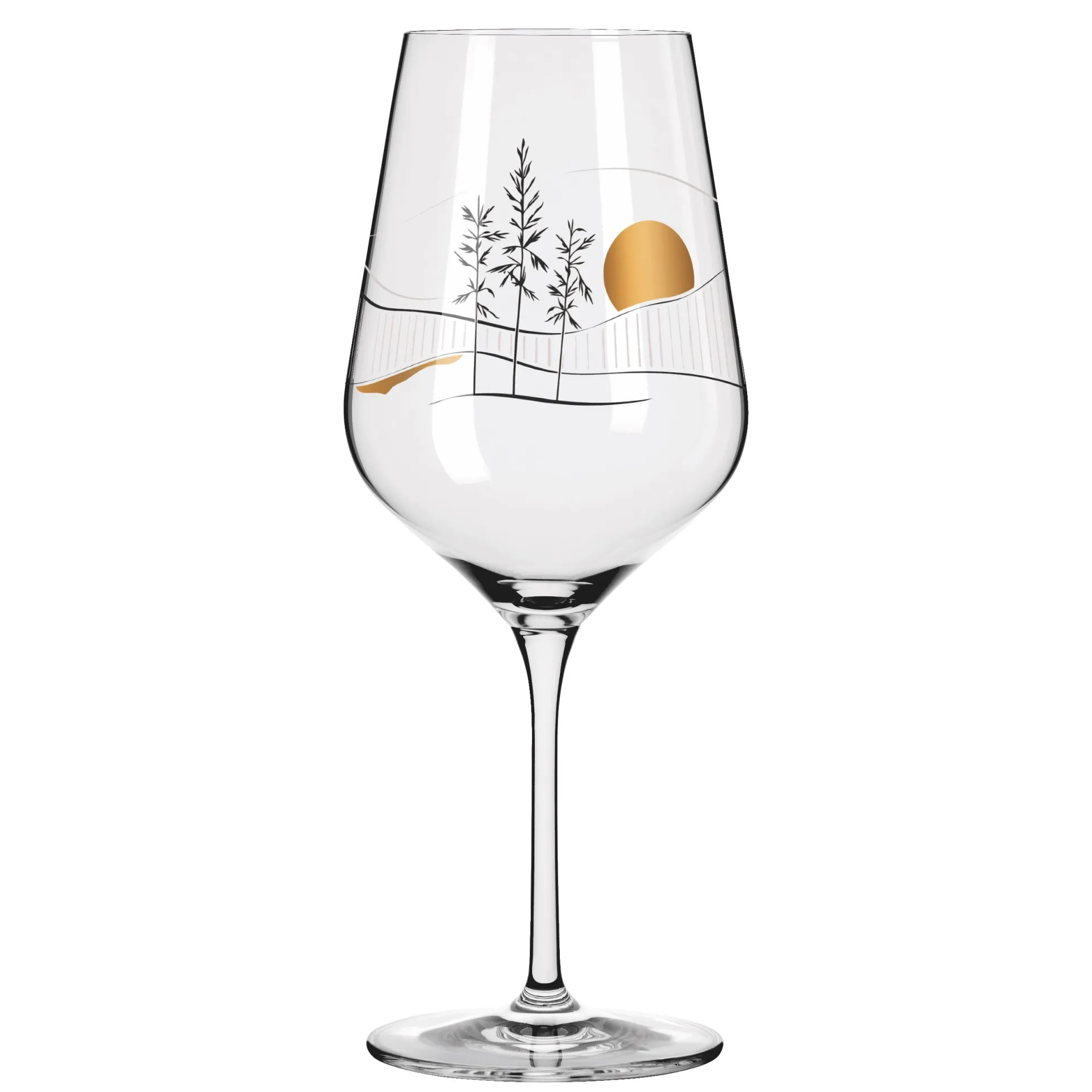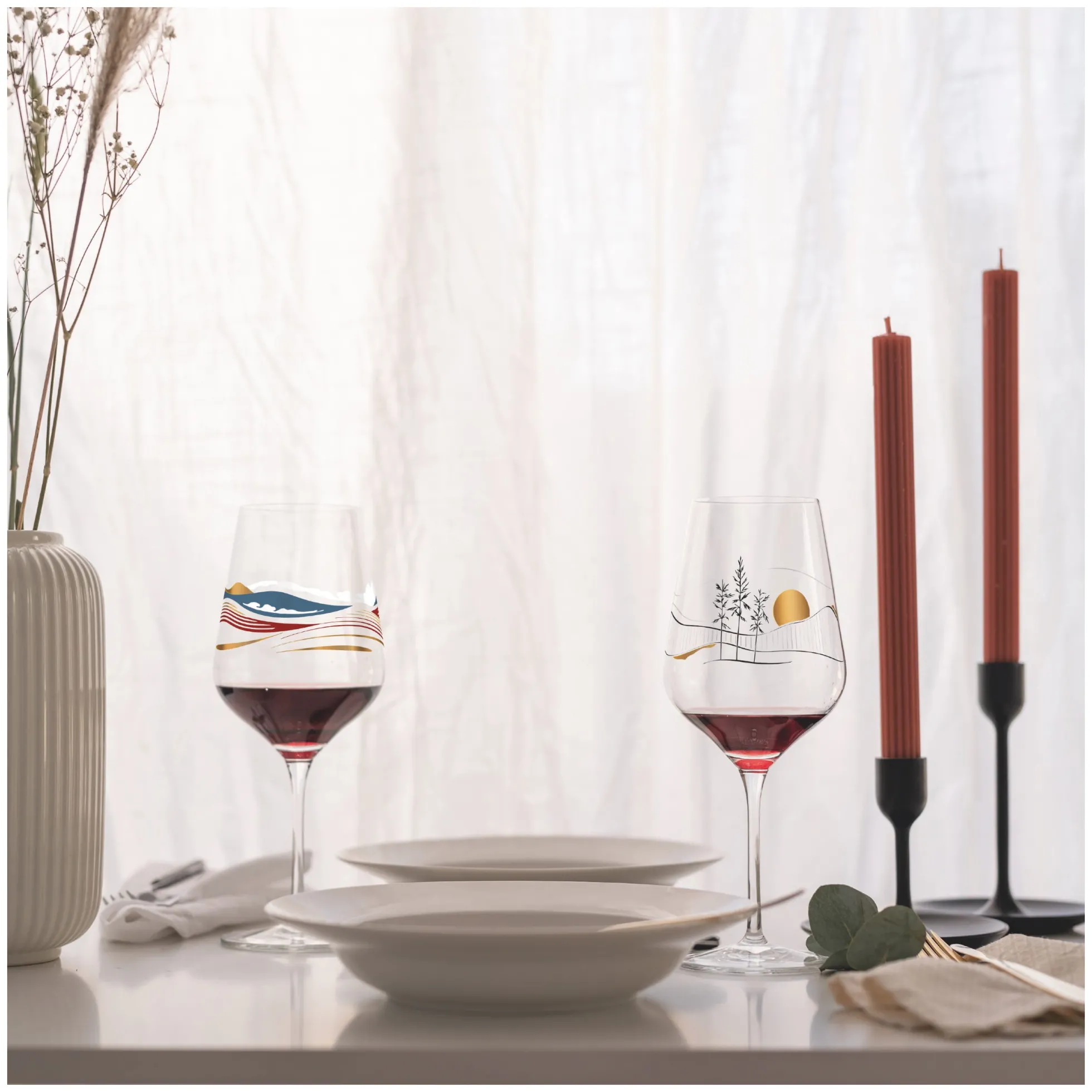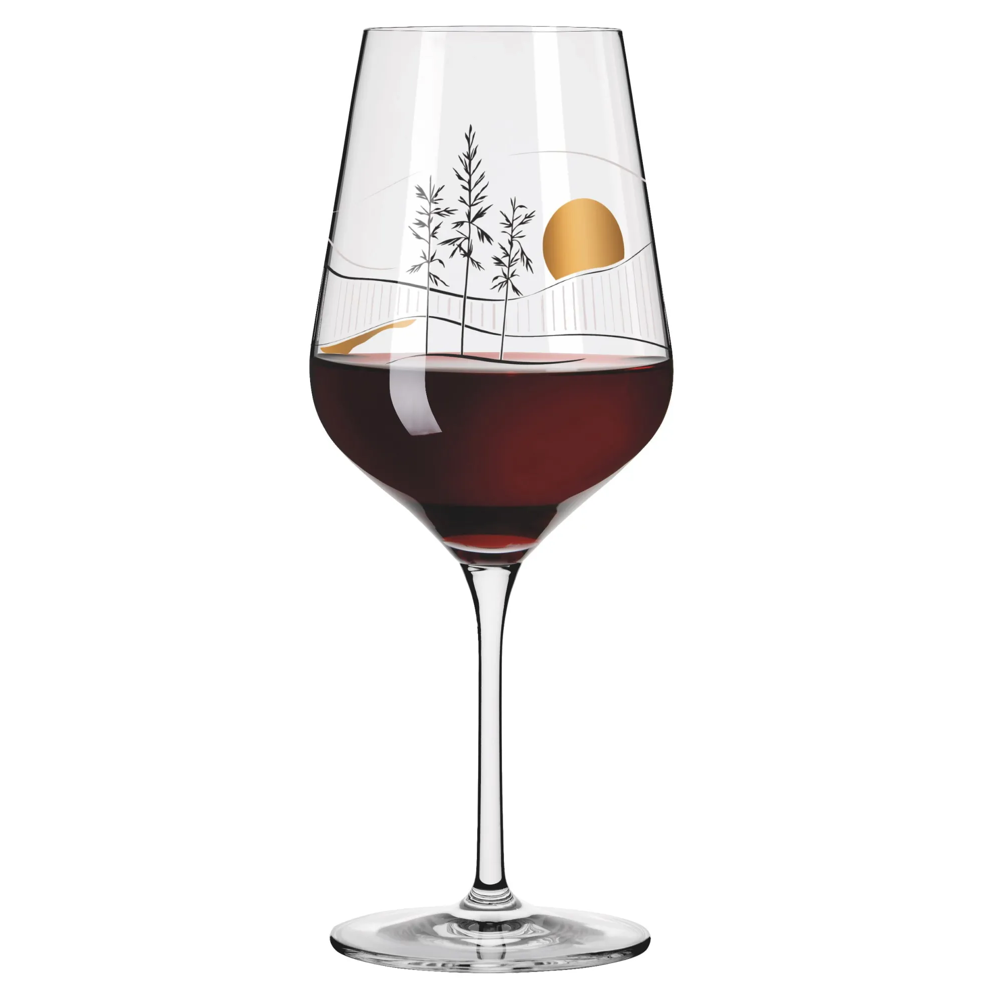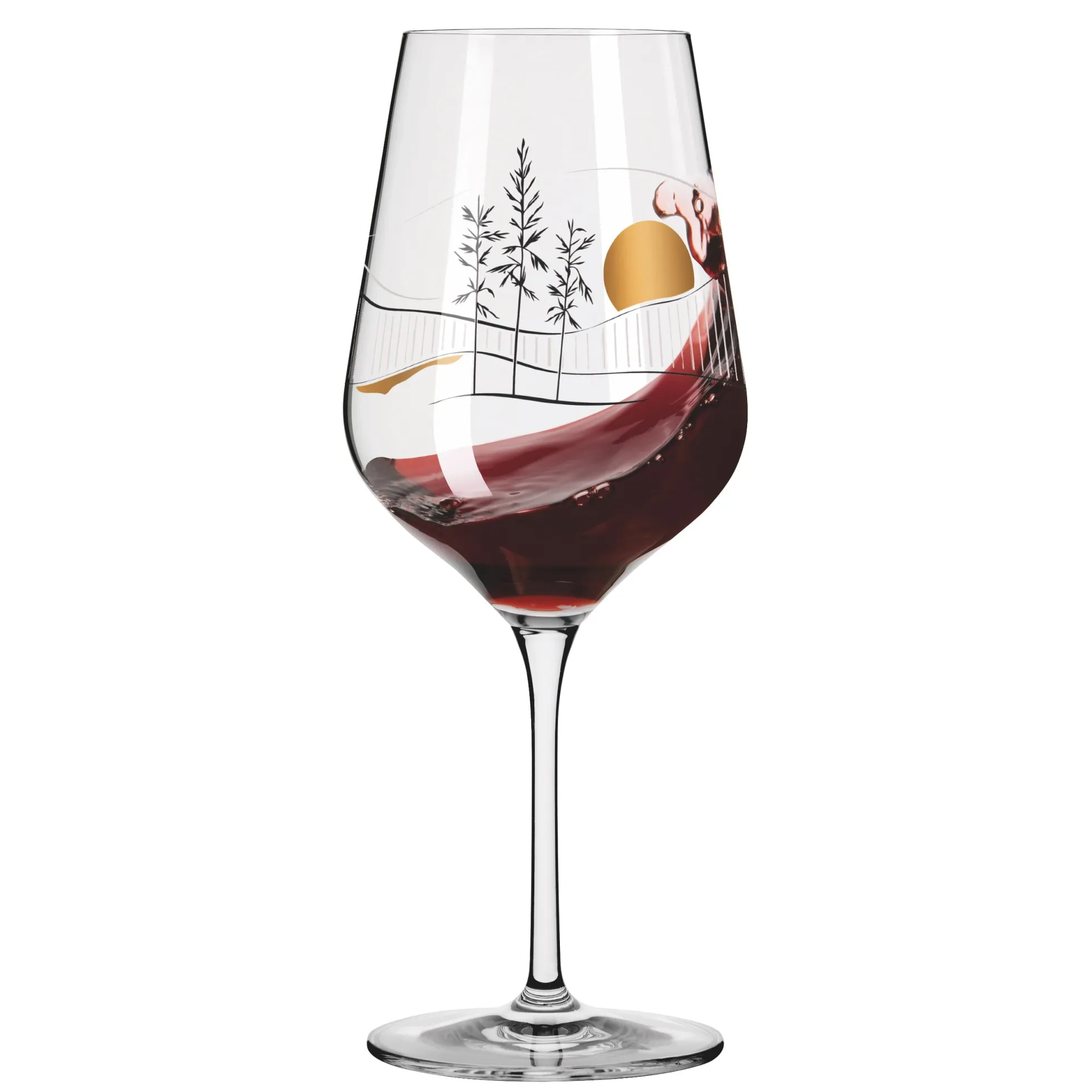 Auf ganzer Linie ausgewogen. Das Rotweinglas strebt nach Harmonie, die es im Stil eines japanischen Stilllebens durch klar arrangierte Strukturen und reduzierte Natur‐Illustrationen erreicht.