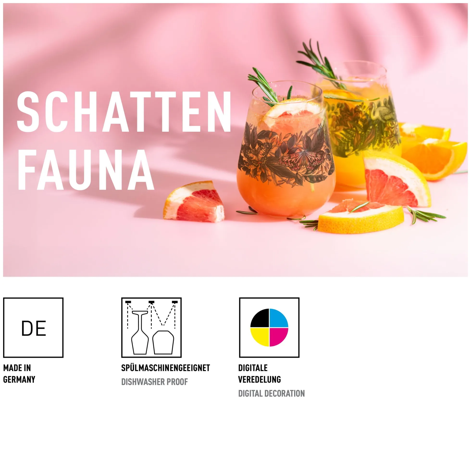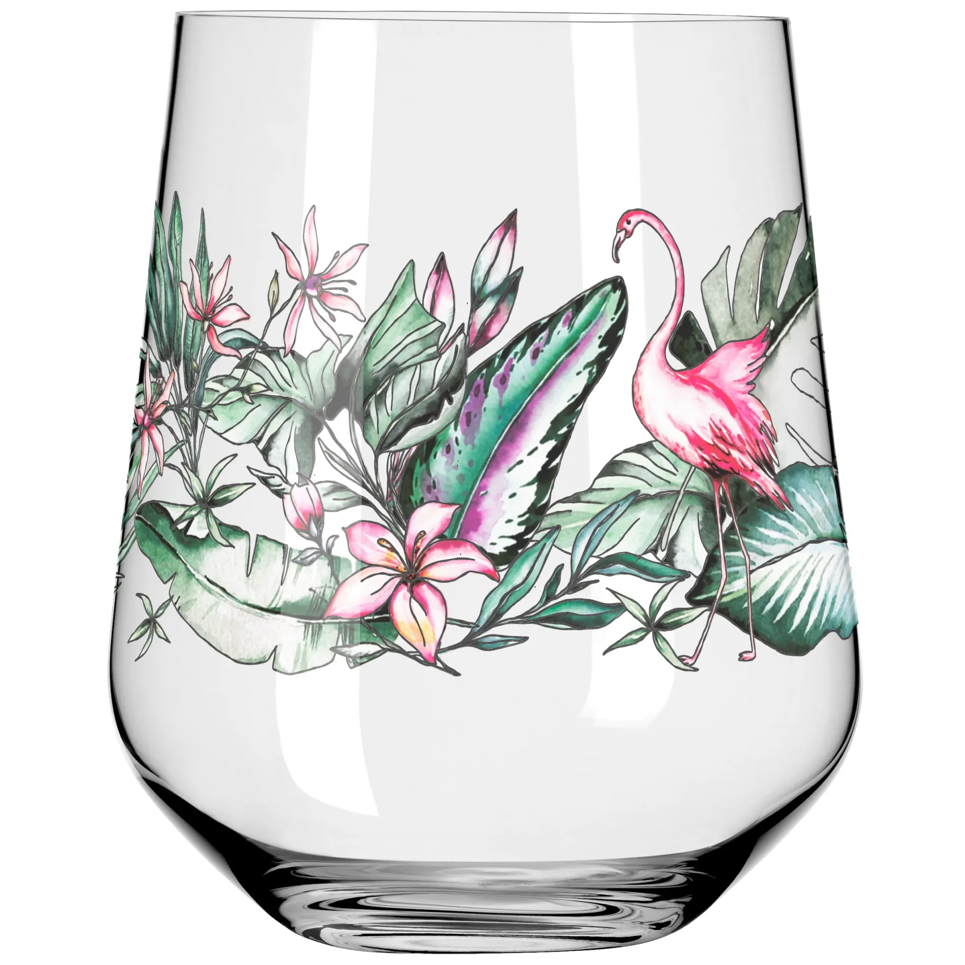 Lebhaftes Getümmel: Im Schutze üppiger Pflanzen schleichen, schwirren und stolzieren exotische Tiere um das Glas, wodurch diesem eine faszinierende Lebendigkeit verliehen wird. Eine Hommage an die Schönheit der Natur!