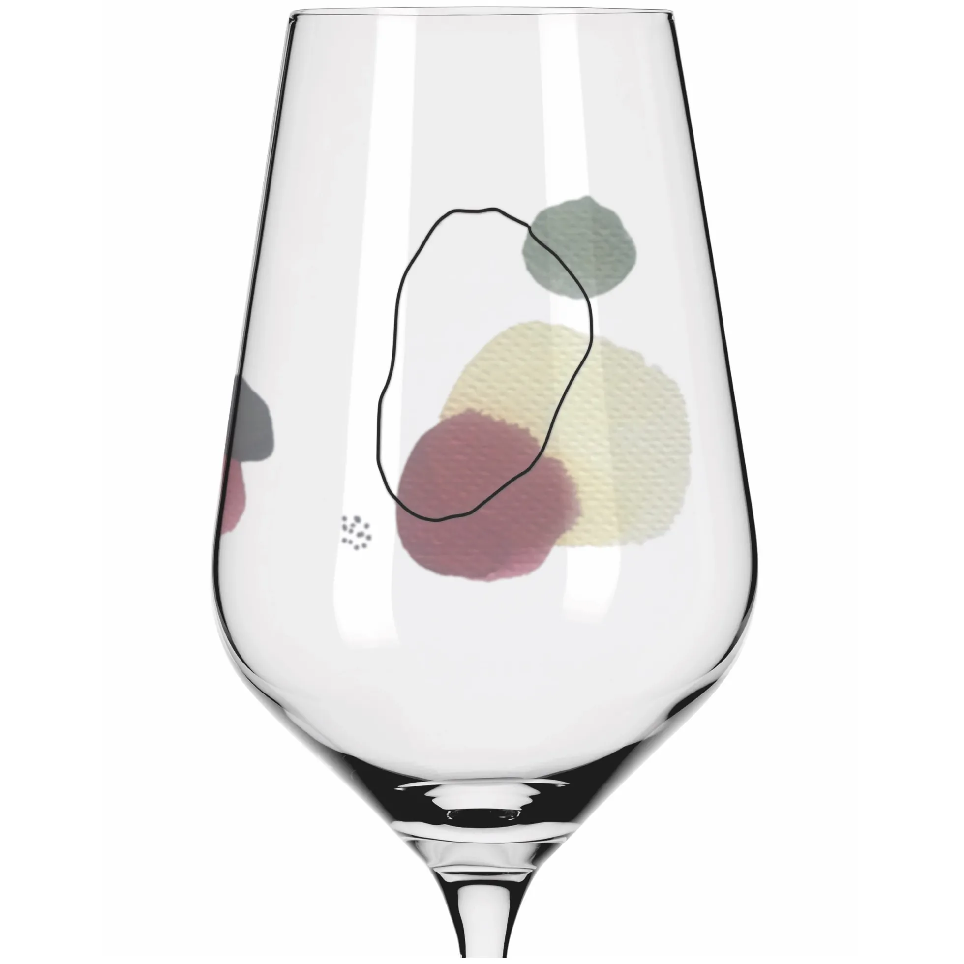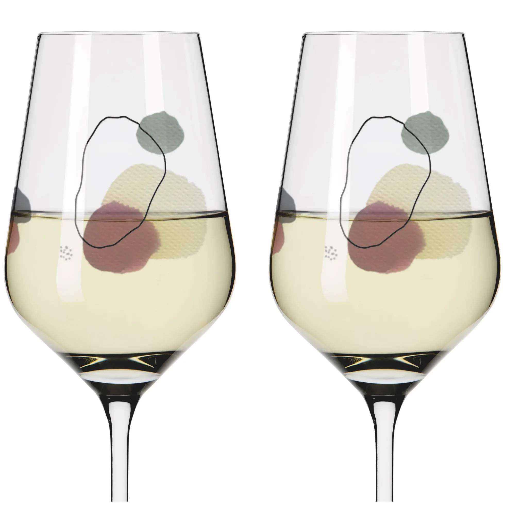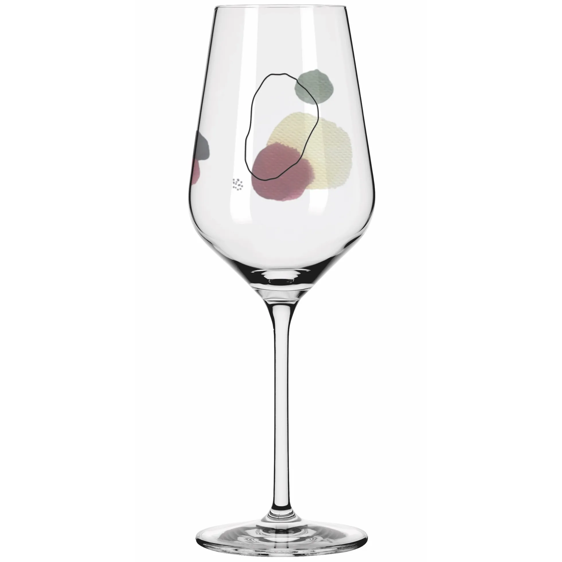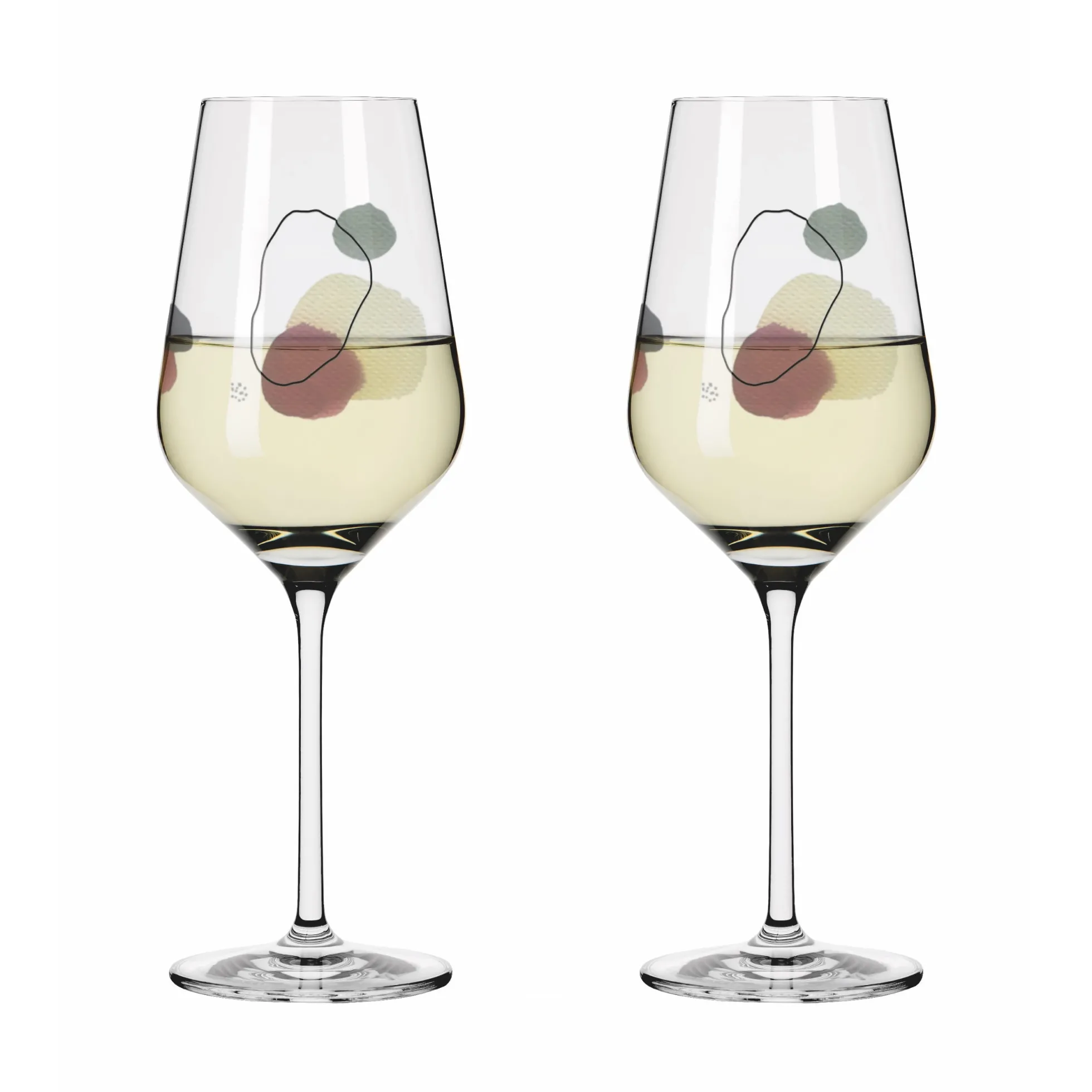 Aquarelltöne, die den Alltag erhellen: Bei dem Weißweinglas‐Set verbinden sich abstrakte Kreise in verschiedenen Formen und Farben zu komplexen Formationen ‐ und lassen viel Freiraum für Inspiration.